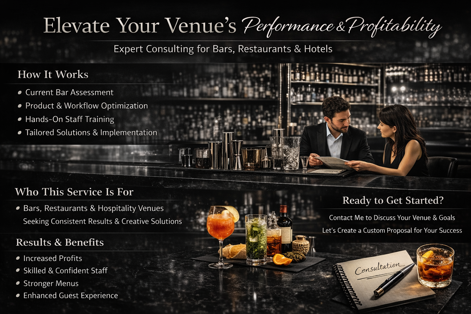 These services are designed for bars, restaurants, hotels and hospitality venues looking to improve performance, consistency and profitability without losing identity or creativity.